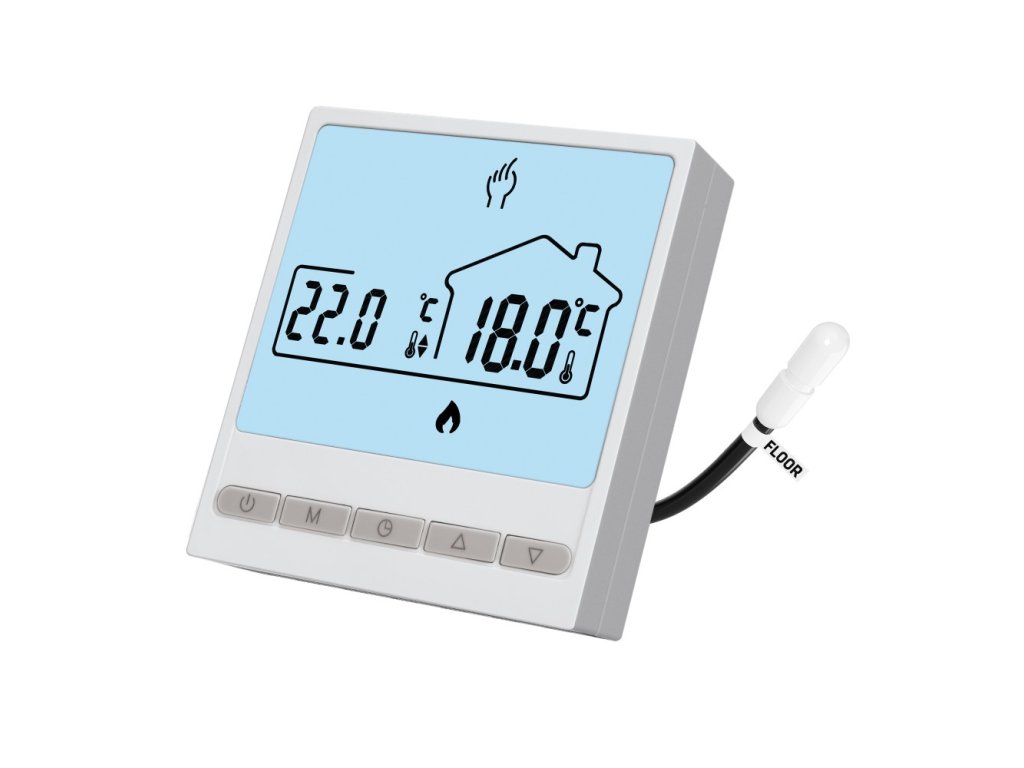 Termostat je vybaven zabudovaným snímačem teploty vzduchu a připojeným externím snímačem teploty podlahy. Termostat může ovládat jak pokojovou teplotu, tak samostatně regulovat teplotu podlahy. Když se termostat používá pro podlahové vytápění, termostat zapne topný systém, aby dosáhl nastavené teploty v místnosti, aniž by umožnil překročení nastavené teploty podlahy, čímž chrání podlahu před nadměrným teplem.